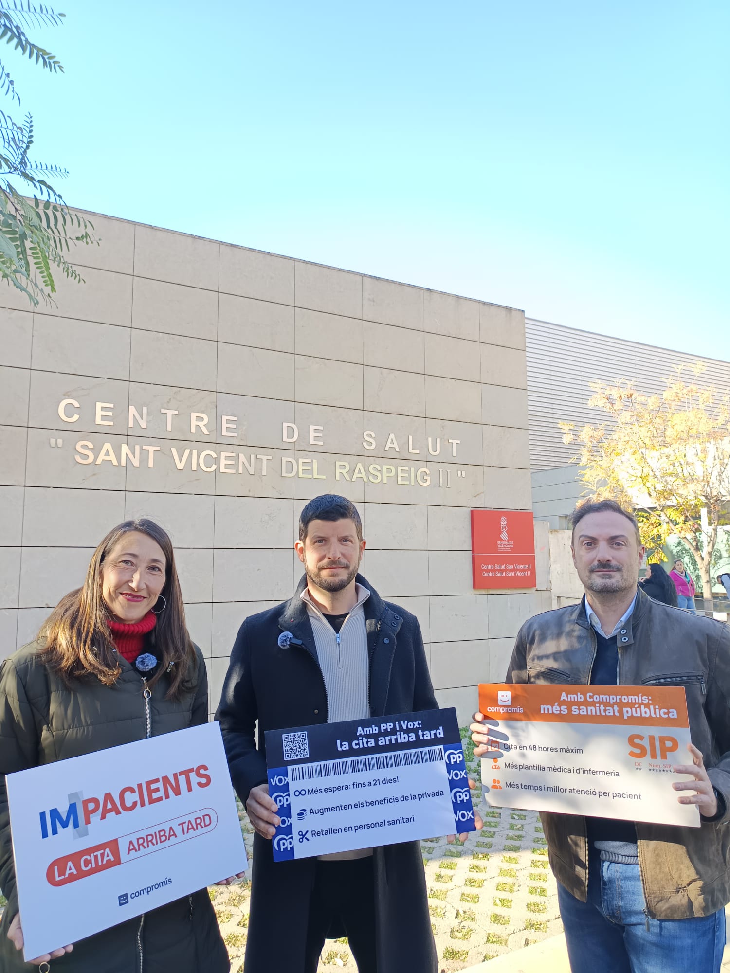 Compromís ha presentado la campaña IM-PACIENTS en Sant Vicent del Raspeig, una iniciativa que denuncia las demoras producidas en la demanda de citas y la comparación con los datos oficiales ofrecidos por el gobierno de Juanfran Pérez Llorca, así como recoger las quejas reales de los pacientes.