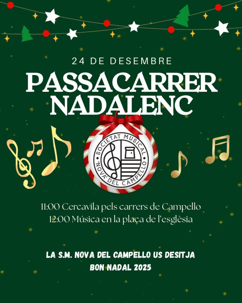 La Societat Musical Nova del Campello celebrará el próximo martes 24 de diciembre su tercer Passacarrer Nadalenc, una iniciativa musical que la banda realiza de forma desinteresada desde su creación y que se ha mantenido de manera ininterrumpida en los últimos años.