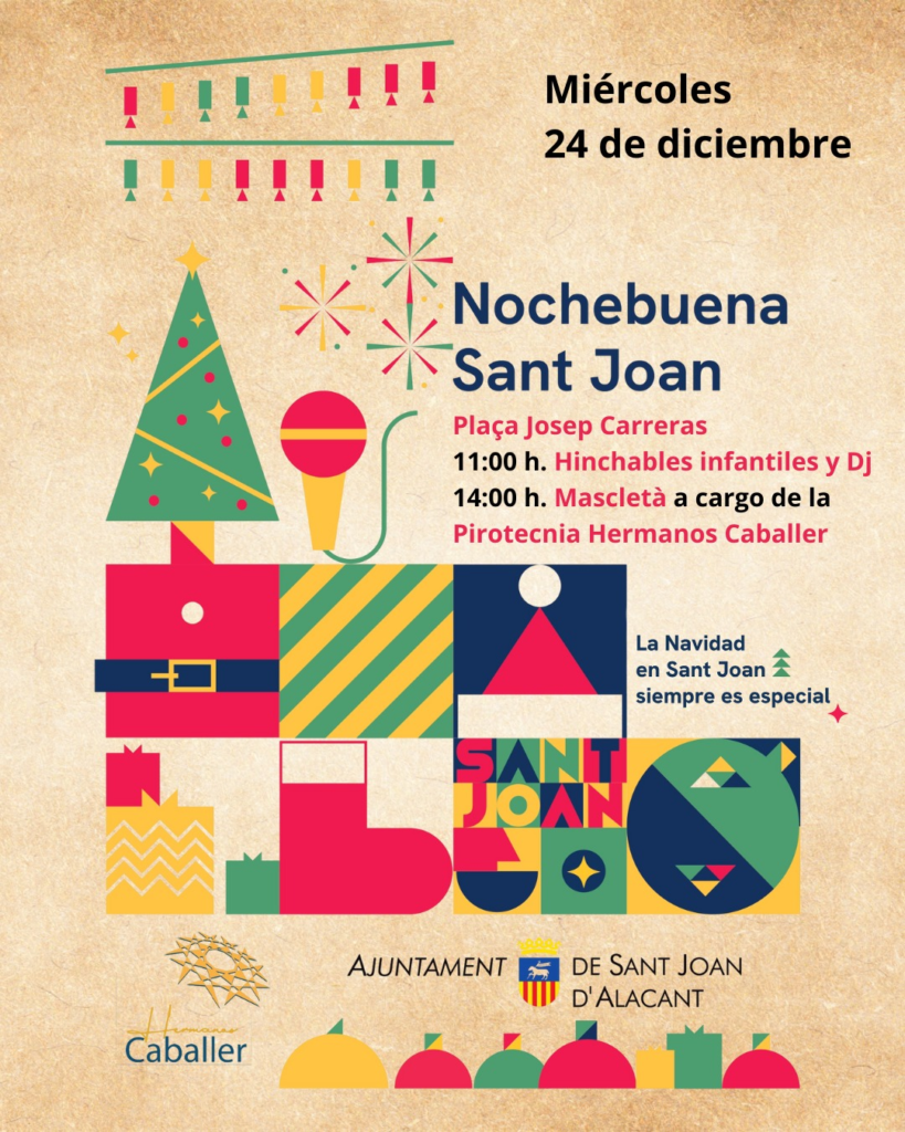 El Ayuntamiento de Sant Joan d’Alacant ha organizado una completa programación para celebrar la Nochebuena 2025 con actividades dirigidas a todos los públicos, que tendrán lugar el próximo miércoles 24 de diciembre en la Plaça Josep Carreras.