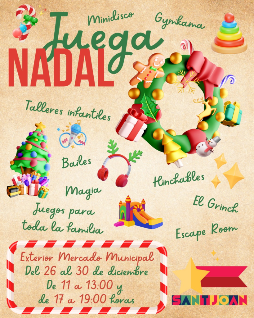 El Ayuntamiento de Sant Joan d’Alacant ha preparado una completa programación de ocio infantil con motivo de las fiestas navideñas bajo el nombre “Juega Nadal 2025”, una propuesta pensada para que niños y niñas disfruten de unas vacaciones divertidas y en familia.