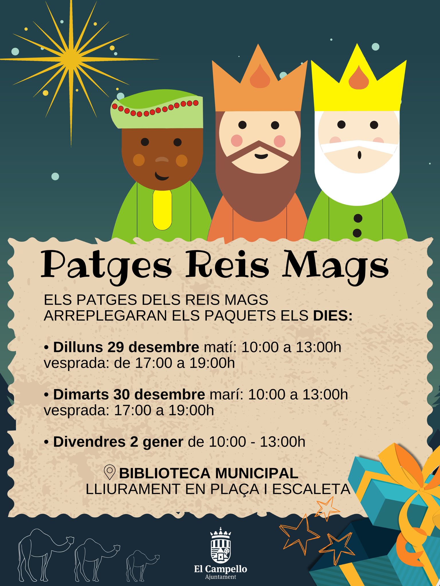 Los días 29 y 30 de diciembre y el 2 de enero, de 10:00 a 13:00 horas el edificio de la Biblioteca Municipal recibirá los regalos que Melchor, gaspar y Baltasar entregarán en mano a los pequeños, bien en la misma Plaza de la Iglesia tras la cabalgata, o subiendo por una escalera a los balcones de las primeras plantas de los edificios por donde discurre el acto, o en los portales de las calles Sant Vicent, avenida Carrer la Mar, avenida Generalitat, Doctor Fleming y calle Mayor.