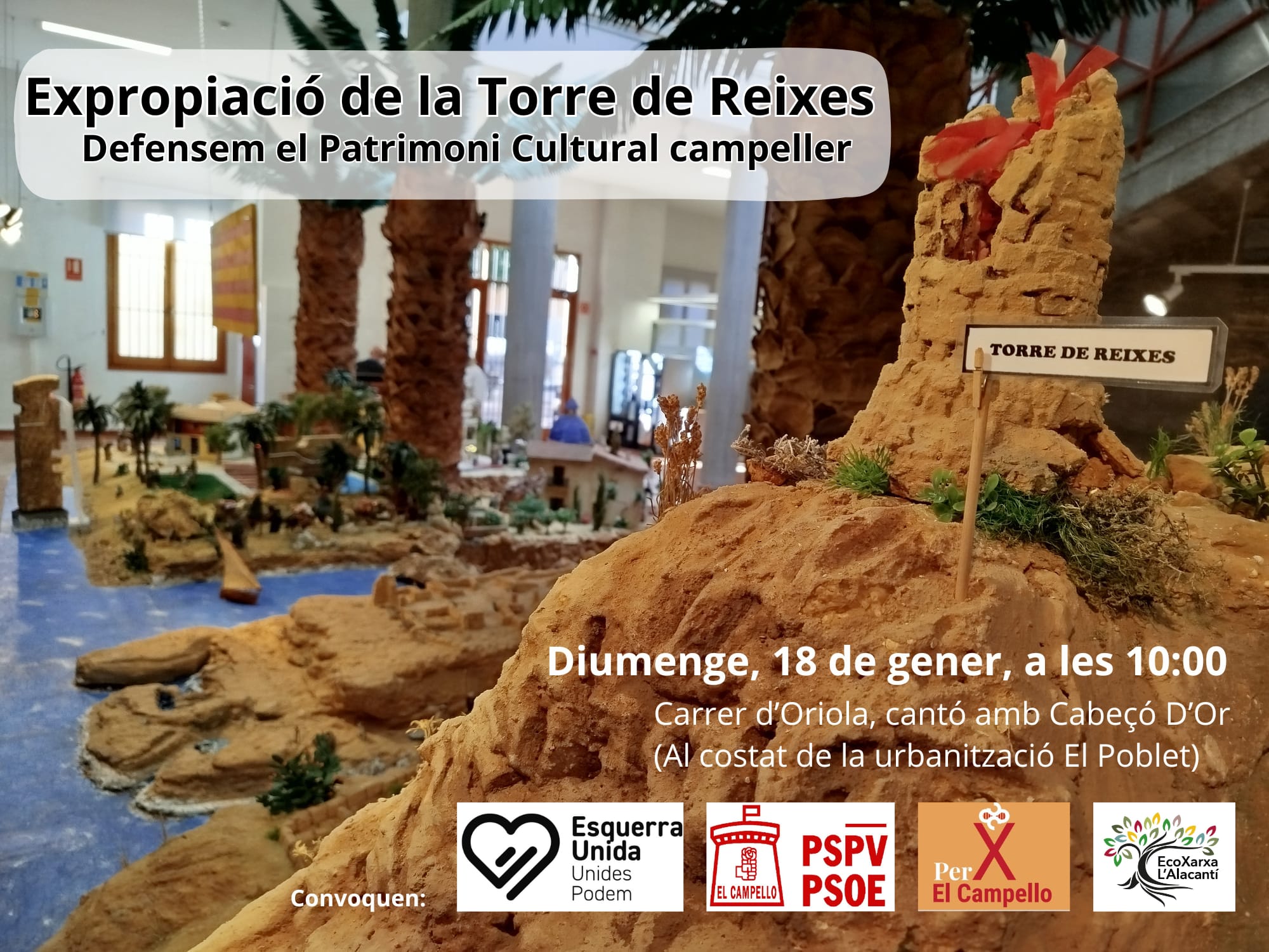 La convocatoria, bajo el lema “Expropiació de la Torre de Reixes. Defensem el Patrimoni Cultural campeller”, partirá desde el carrer d’Oriola, en el cruce con Cabeçó d’Or, junto a la urbanización El Poblet, y pretende volver a visibilizar la necesidad urgente de proteger uno de los elementos patrimoniales más emblemáticos de El Campello.