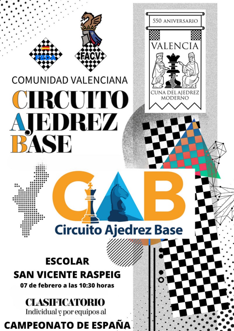 San Vicente del Raspeig acogerá el próximo sábado 7 de febrero, a partir de las 10:30 horas, una nueva cita del II Circuito de Ajedrez Base de la Comunidad Valenciana, que se celebrará en el nuevo Pabellón Municipal de la localidad.