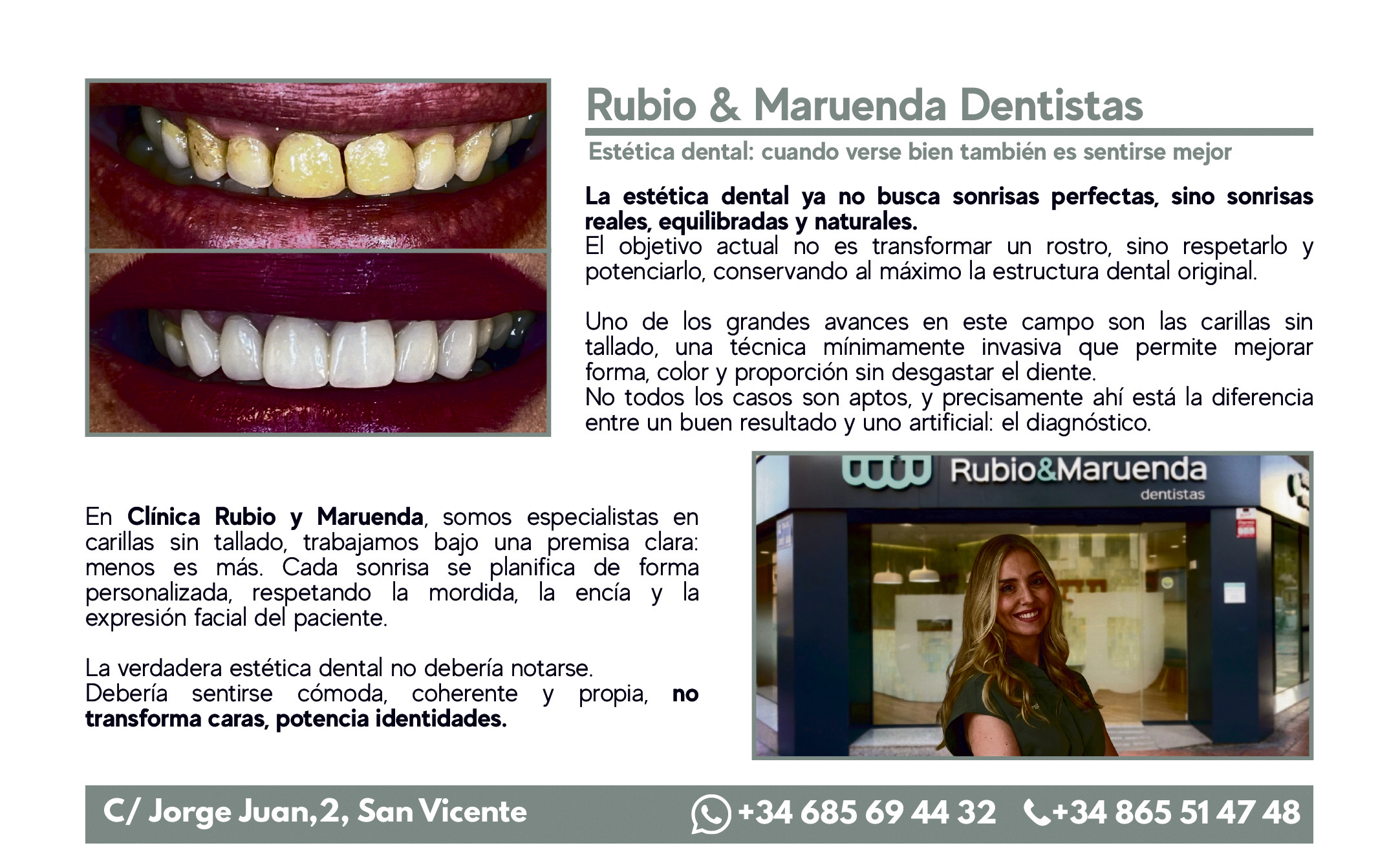 La clínica está ubicada en la calle Jorge Juan, 2, en San Vicente, y ofrece atención personalizada a quienes buscan mejorar su sonrisa desde un enfoque respetuoso y actual.