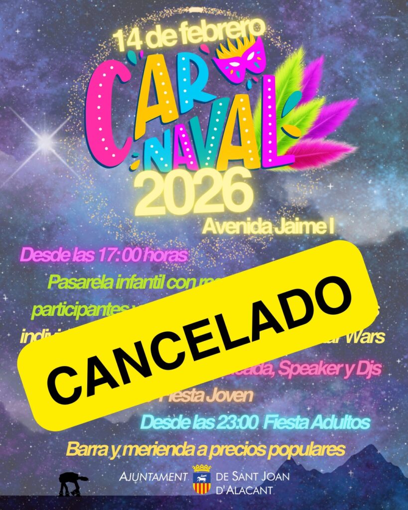 Ante esta situación, el Ayuntamiento de Sant Joan d’Alacant ha decidido suspender las actividades previstas al aire libre, incluida la Fiesta de Carnaval que iba a celebrarse el sábado 14 de febrero en la Avenida Jaime I.