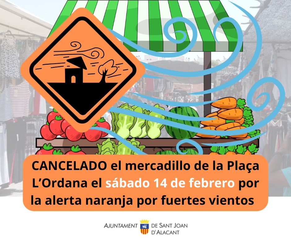 La decisión se toma en el contexto de la alerta naranja por fuertes vientos activa en la provincia, que afecta a la actividad exterior en el municipio de Sant Joan d’Alacant. Desde el consistorio se insiste en que la prioridad es garantizar la seguridad de vecinos, comerciantes y visitantes ante la previsión de rachas intensas de viento durante la jornada del sábado.