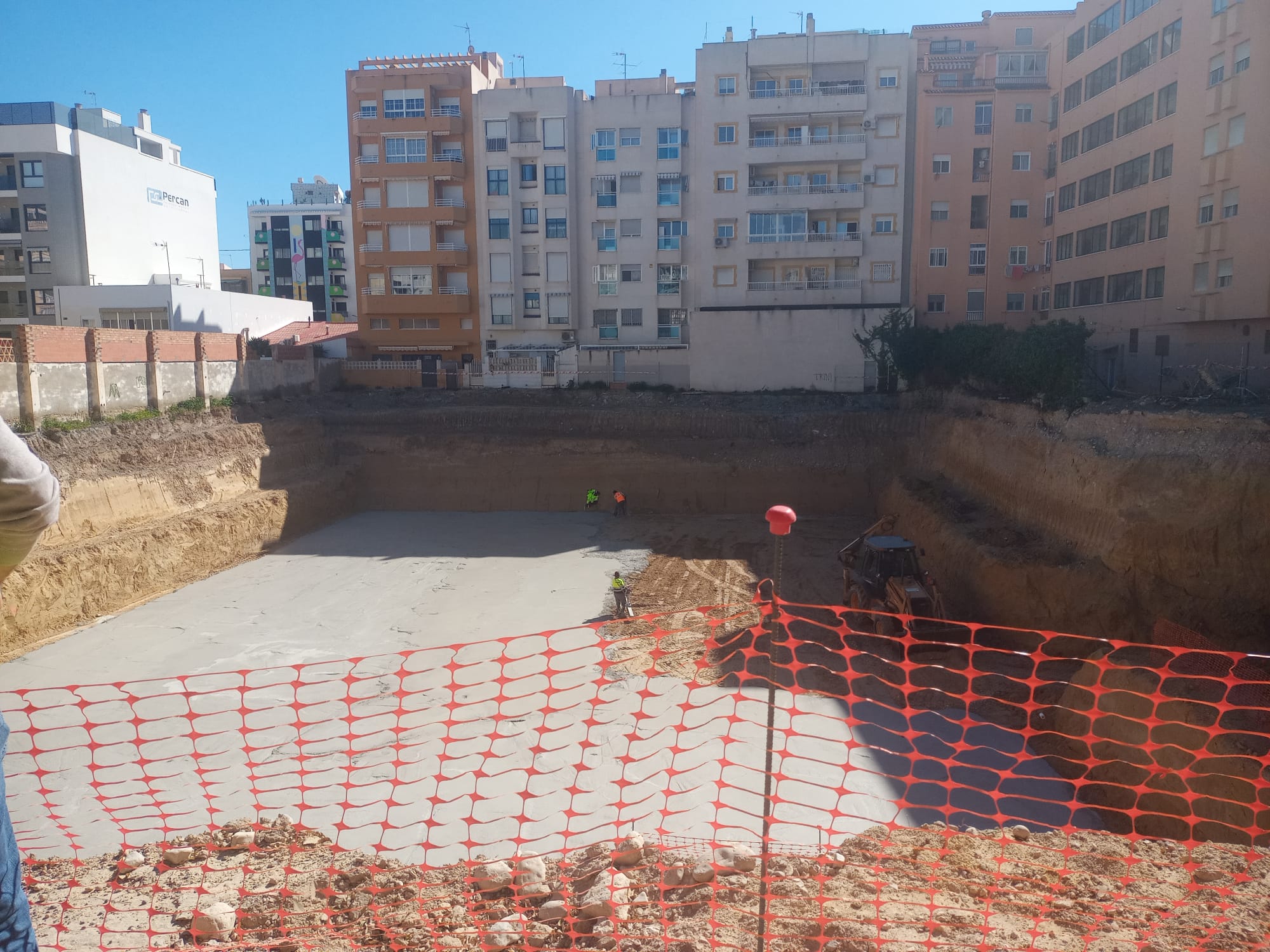 Tal y como anunció el jefe de obra, la reurbanización del parque Gabriel Miró y su entorno ha llegado ya a la fase en la que la maquinaria ha cubierto de hormigón la base de la gran cavidad excavada en el terreno, una importante infraestructura que tendrá 38’5 metros de largo, 21’50 de ancho y 6 de altura.