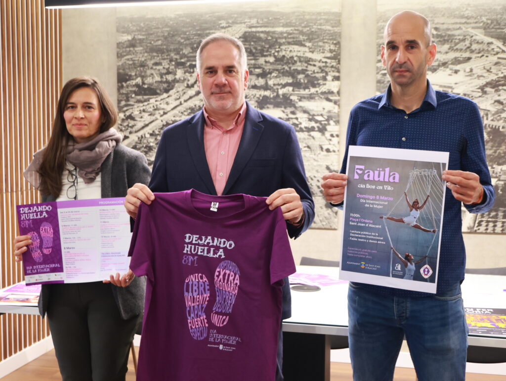 El alcalde de Sant Joan d’Alacant, Santiago Román; el concejal de Igualdad, Marcos Piña; y la agente de Igualdad municipal, Catherine Boix, han dado a conocer los detalles de la programación del 8M abierta a toda la ciudadanía, una programación que se extiende a lo largo del mes de marzo y que va dirigida a muchas esferas de la sociedad. Precisamente, el alcalde, Santiago Román, ha incidido en que “la campaña traspasa el día 8 de marzo y ofrece actos durante varias semanas, unos actos en los que están implicadas varias concejalías y varios públicos potenciales, que no centramos solo en la mujer y en los centros educativos, sino que llevamos al deporte, la cultura o las personas mayores”.