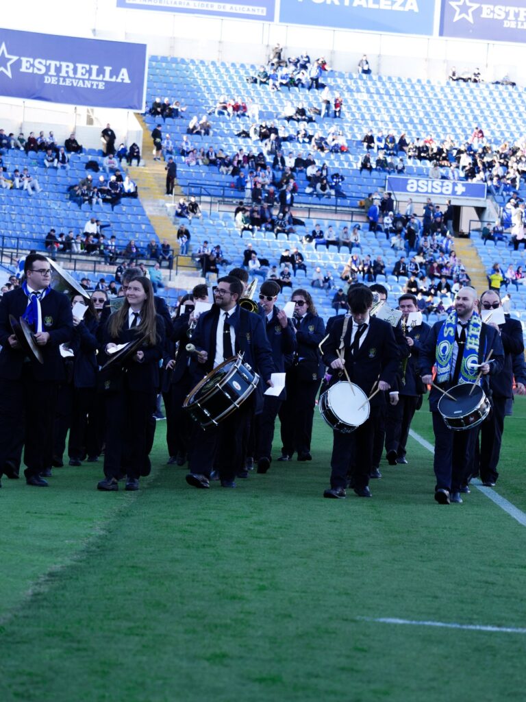 Los músicos de la banda mutxamelera acudieron al estadio para poner la nota musical a la jornada futbolística, interpretando diferentes piezas y contribuyendo a crear un ambiente festivo en las gradas. Su presencia formó parte de la animación del encuentro, en una tarde en la que el fútbol y la música se dieron la mano ante miles de aficionados.