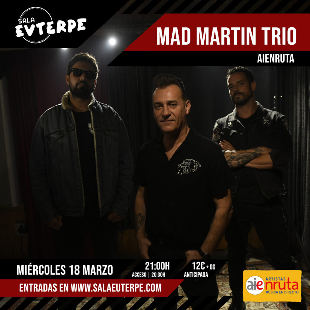 El miércoles 18 de marzo a las 21h puedes ver a una de las bandas más sólidas de la escena del rock and roll clásico en España, Mad Martin Trio, reconocida por la potencia de sus directos. Liderado por Martín Esturao —quien formó parte de formaciones gallegas como Clan Moriarty, Los Feliz, The Tombstones o Dr. Gringo— el grupo ha compartido escenario con artistas de la talla de Neil Young, ZZ Top, Crazy Cavan o JD McPherson. Su debut llegó en 2014 con Seven Lucky Shots. En 2015 ganaron el concurso “Azkena Rock Party”, lo que les aseguró un puesto en el emblemático festival. Con más de 1.000 conciertos por Europa y España, han pasado por festivales como Big Lake Run (Suecia), Rock at Sea (Suecia), Wildest Cats in Town (Inglaterra), Carthago Rockin’ (Alemania), Motorbeach, Rockin’ Race Jamboree o el Outono Códax Festival. Este es un concierto dentro del ciclo de AIEnruta, subvencionado por AIE.