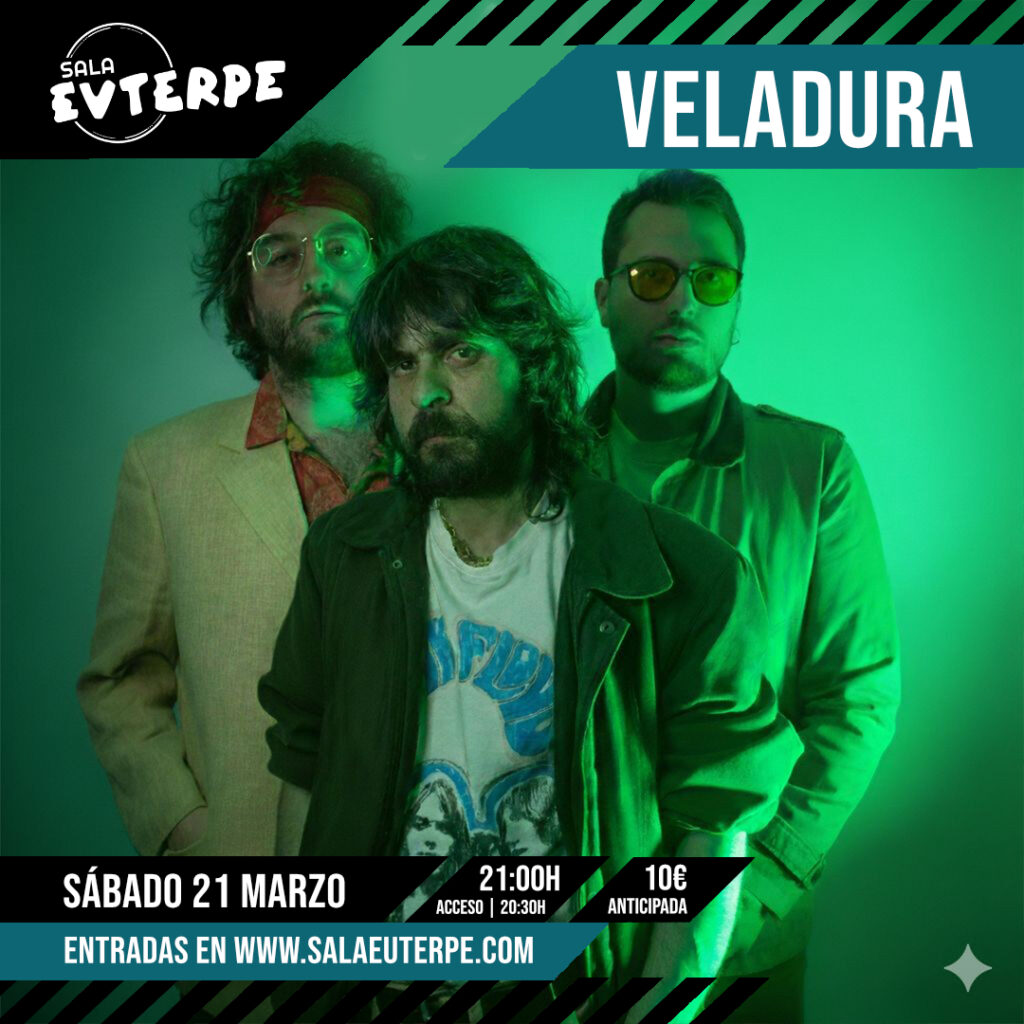 Para poner el broche final al fin de semana, llega por primera vez al escenario de Euterpe la banda murciana más famosa en redes sociales, Veladura. Actuarán el sábado 21 de marzo a las 21h, para presentarnos sus primer disco y nuevos temas que están llevando por gran parte del territorio nacional mostrando su genuino rock auténtico; rock de autor lleno de emoción, dinamismo y textos desgarrados.