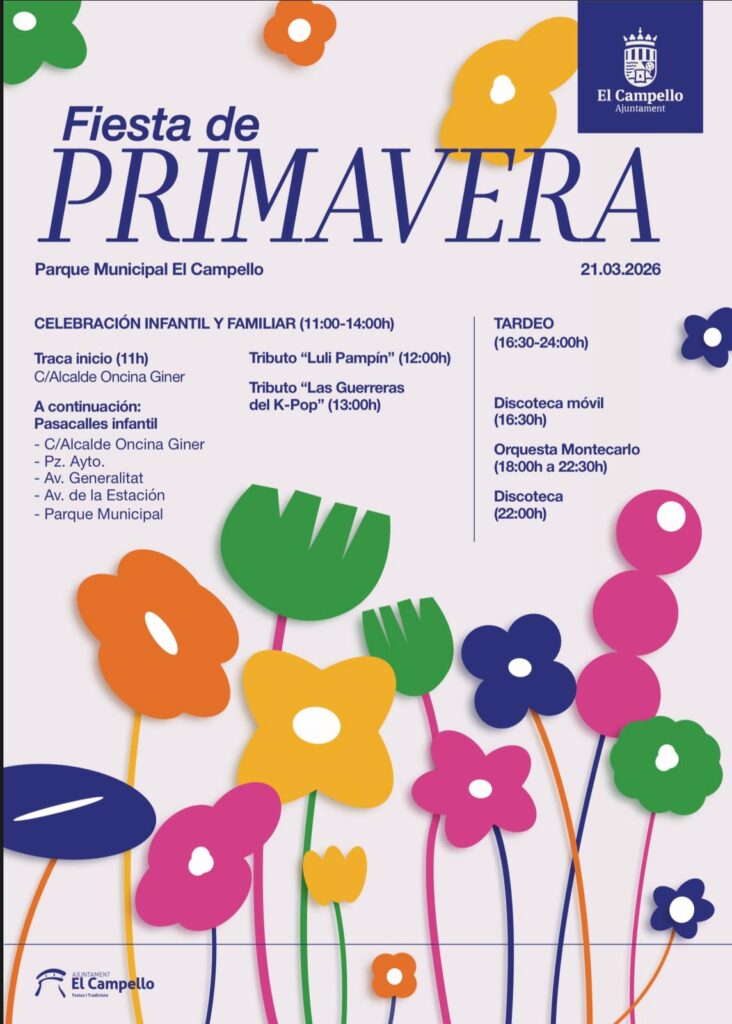 Después de un invierno ciertamente poco frecuente, con muchas jornadas de viento y lluvia, por fin llega la primavera. Por ello, la concejalía de Fiestas y Tradiciones de El Campello que dirige Marisa Navarro ha decidido programar para el próximo domingo, al aire libre en el Parque Central, la bautizada como “Fiesta de la Primavera”, en la que desde las 11:00 horas hasta pasadas las 12 de la noche se sucederán actos pensados para disfrute de toda la familia.