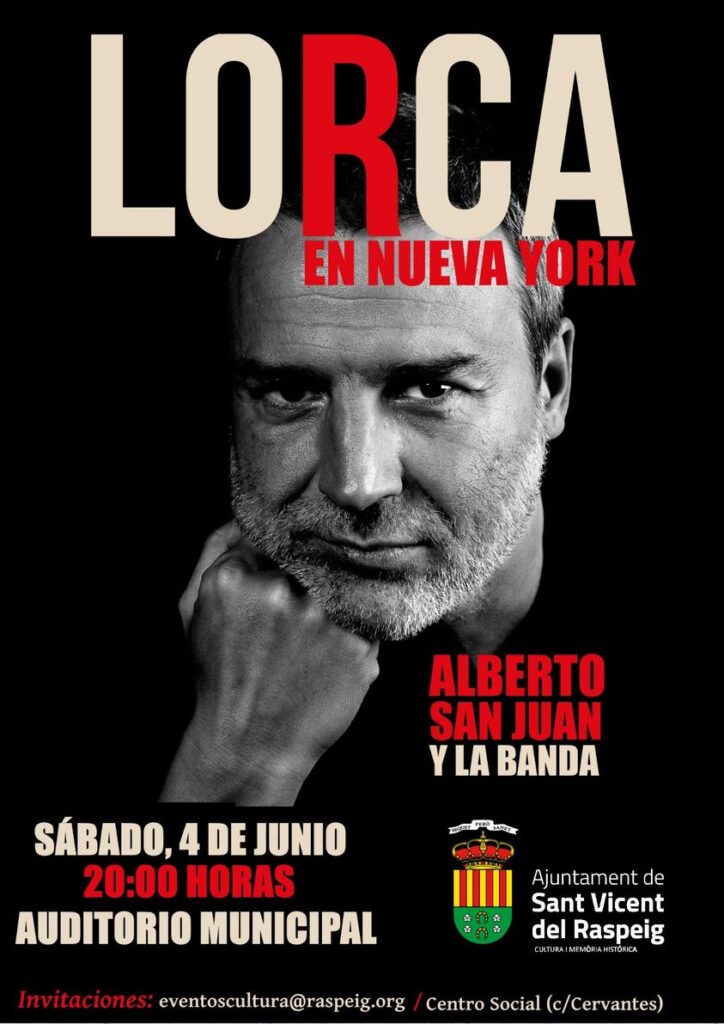 La palabra de Lorca en la voz de Alberto San Juan resulta sobrecogedora. Transmite una fuerza brutal. Se escuchará el sábado, 4 de junio, a las 20.00 horas, en el Auditorio Municipal de San Vicente del Raspeig. Lo ha programado gratuitamente la concejalía de Cultura y Memoria Histórica, cuya titular, Raquel Rodríguez, de Esquerra Unida, […]