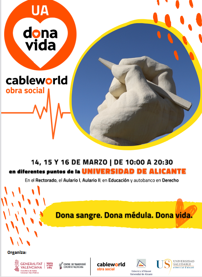 Obra Social Cableworld junto al centro de transfusiones, la Universidad de Alicante y la Consellería de Sanitat, organizan una donación múltiple, la primera que se extenderá durante tres jornadas bajo el lema ‘Dona sangre. Dona médula. Dona vida’. Tendrá lugar la próxima semana, días 14, 15 y 16 de marzo entre las 10h y las […]