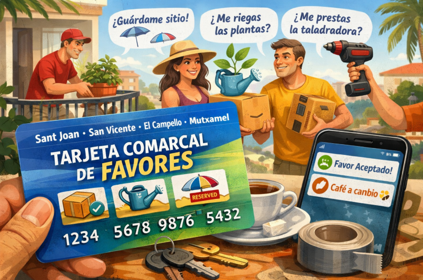 L’Alacantí, 28 de diciembre — Los ayuntamientos de Sant Joan d’Alacant, San Vicente del Raspeig, El Campello y Mutxamel han anunciado de forma conjunta una innovadora medida para reforzar la convivencia vecinal: la creación de la Tarjeta Comarcal de Favores, un sistema pionero que permitirá a los vecinos solicitar pequeños favores entre municipios sin sentirse […]