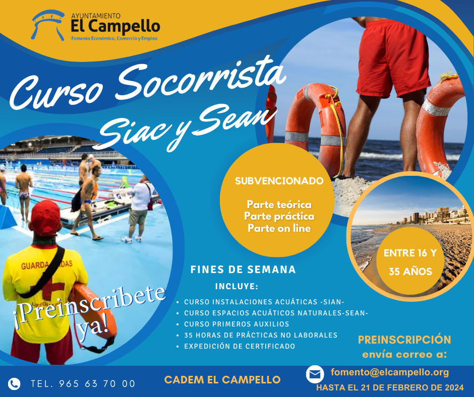 El curso será semipresencial, con prácticas en piscina y en playas La concejalía de Fomento y Empleo del Ayuntamiento de El Campello, que dirige Marisa Navarro, oferta un curso de socorrista en instalaciones acuáticas (SIAN) y socorrista en espacios acuáticos (SEAN), cuyos interesados deberán tener necesariamente entre 16 y 35 años. Las clases teóricas serán […]