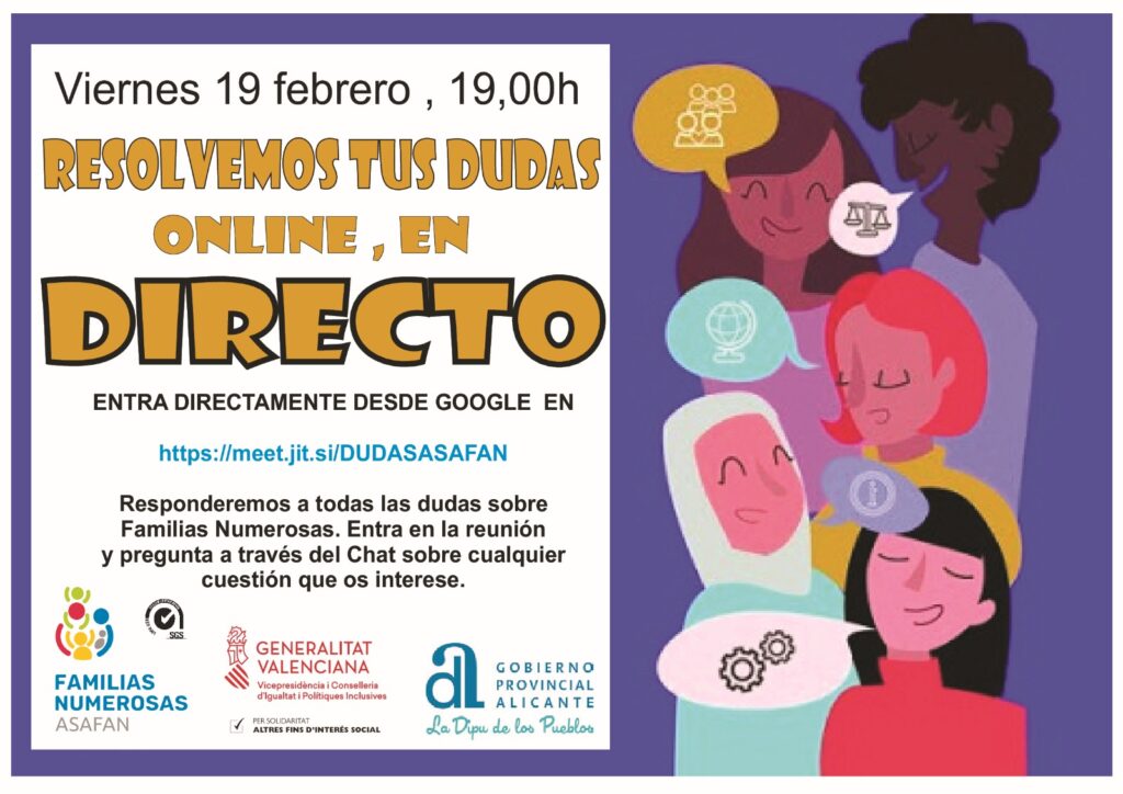 El encuentro online de ASAFAN para familias numerosas, organizado por la concejalía de Familia, dirigida por Mercé Pairó (Cs), anima a todas las familias numerosas campelleras a participar en el encuentro online que ASAFAN, “Asociación Alicantina de Familias Numerosas”, en El Campello, ha organizado para todas ellas. La actividad tiene lugar hoy, viernes 19 de […]