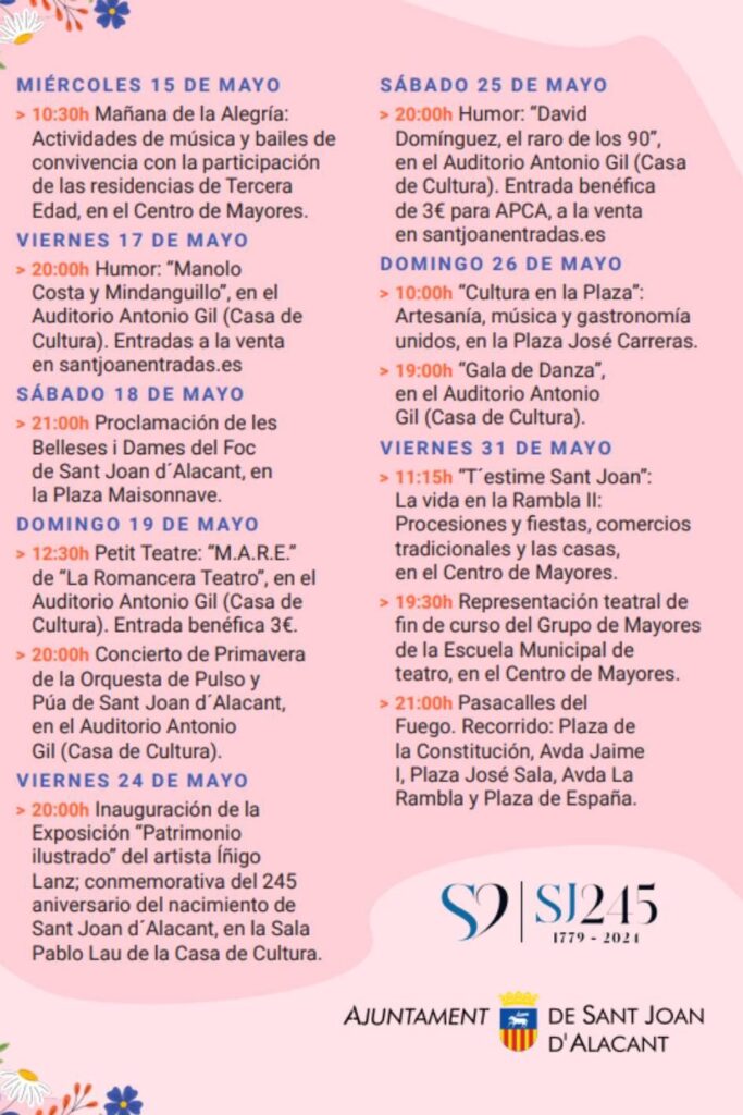 El Ayuntamiento de Sant Joan d’Alacant se complace en invitar a residentes y visitantes a disfrutar de un fin de semana lleno de actividades culturales y de entretenimiento. A continuación, detallamos la programación de eventos desde hoy, viernes 24 de mayo, hasta el domingo 26 de mayo. Viernes, 24 de mayo Sábado, 25 de mayo […]