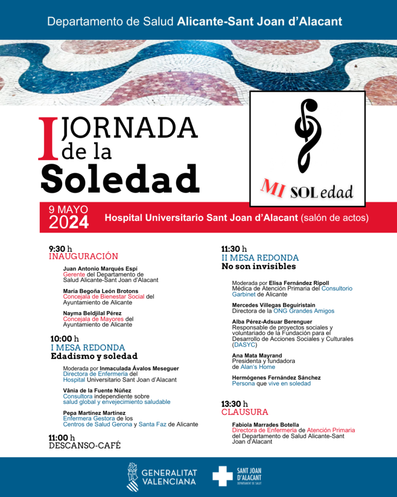 El departamento de salud Alicante-Sant Joan d’Alacant ha organizado la “I Jornada de la Soledad” que se celebrará en el salón de actos del Hospital Universitario Sant Joan d’Alacant el próximo 9 de mayo a partir de las 9:30 horas con el lema “Mi Soledad”. El objetivo es realizar una primera toma de contacto para […]