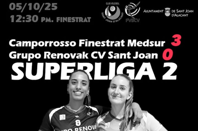 El Grupo Renovak CV Sant Joan arrancó su andadura en la Superliga 2 con una derrota por 3-0 ante el Camporrosso Finestrat Medsur, en un encuentro disputado este domingo en el pabellón de Finestrat. Los parciales del choque fueron 25-18, 25-15 y 25-19, reflejando la superioridad local en los momentos clave. El conjunto sanjuanero afrontó […]
